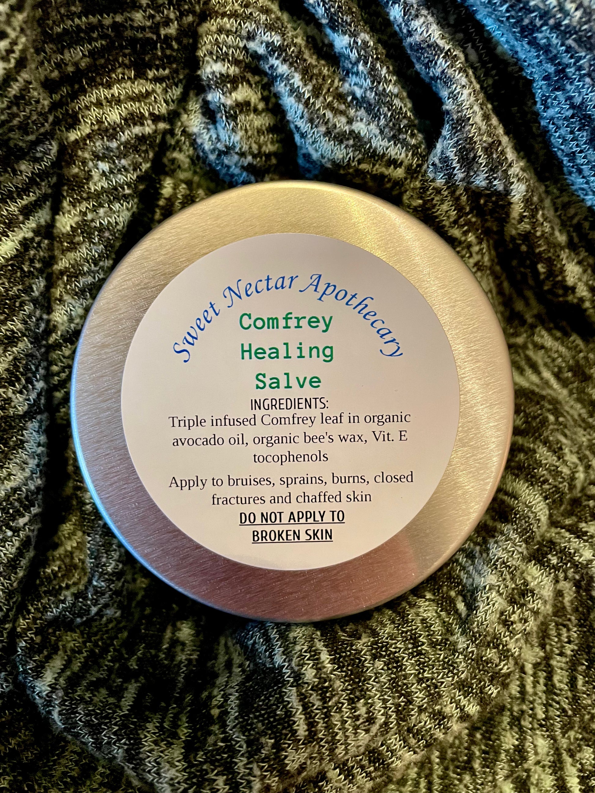 This salve is handmade with triple infused Comfrey leaf in organic cold pressed avocado oil.